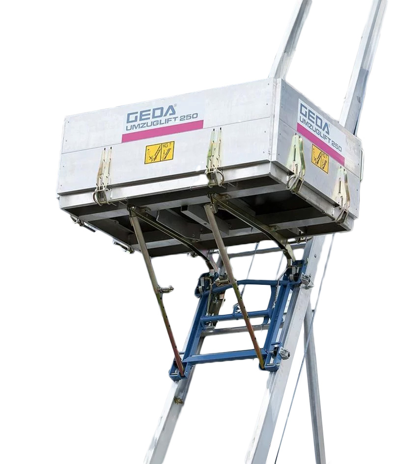 Selbst in schwierigen örtlichen Gegebenheiten, wie beispielsweise engen Hinterhöfen, findet dieser agile Transporthelfer seinen Platz. Die Montage und Aufstellung des GEDA Umzuglifts erfolgt blitzschnell und ohne jeglichen Bedarf an Werkzeugen, dank seiner einfachen Handhabung. Zudem bietet er die Flexibilität, entweder mit einer starren Bühne oder einer beweglichen Drehbühne ausgestattet zu werden.